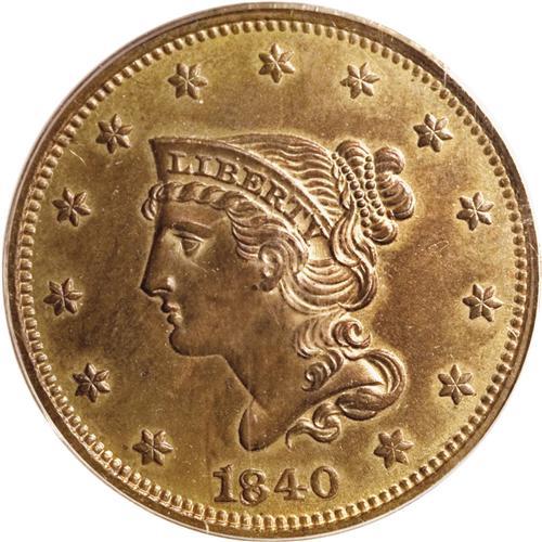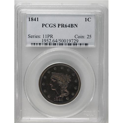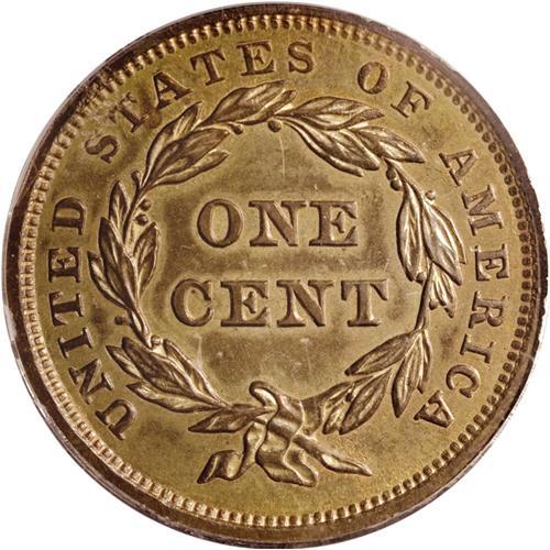 <B>1840<1C> PR63 Red and Brown PCGS.</B></I> N-2, High R.6 as a proof. Blundered date with sharply repunched 18, a rather surprising choice of the obverse die to coin proof examples of this date. The features of the repunched date are extremely sharp. The dentils along the right side of the obverse and the right side of the reverse clearly show evidence of more than one strike. The fields are fully reflective with light brown and iridescent toning over golden surfaces that have faded slightly from original mint color. A few minor specks are evident on the obverse, and a short vertical scratch can be seen inside the wreath on the reverse. A small U-shaped lint mark is noted in the right obverse field near star 10. EAC PR63.<BR><I>Ex: Bowers and Merena (10/2000), lot 280; American Numismatic Rarities (6/2004), lot 2233.</B></I>