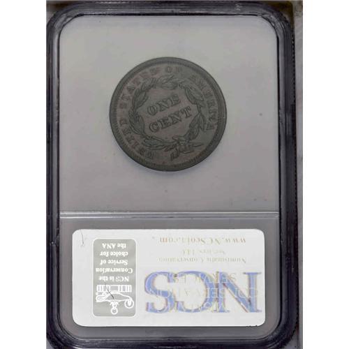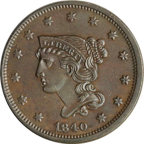 <B>1840<1C> Small over Large Date. N-2, R.2--Reverse Planchet Flaw--NCS. Unc. Details. XF45 EAC.</B></I> Grellman state a. The 18 in the date is dramatically recut. A lamination, mostly retained, on the CA in AMERICA, is apparently referred to by the NCS designation. The obverse also has a small retained lamination on the second star. Well struck save for some left side stars. Primarily golden-brown in color, although steel-blues hues on the portrait and OF A on the upper right reverse suggest a long-ago cleaning.<BR><I>Ex: George Ramont (5/25/1971).</B></I> Envelope Included.