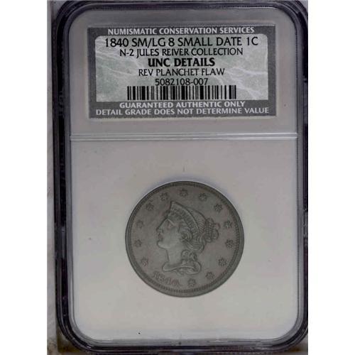 1840 1C Small/Large Date--Reverse Planchet Flaw--NCS. 1840[1C] Small over Large Date. N-2, R.2--Reve