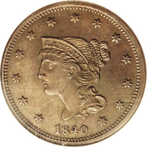 <B>1840<1C> Small Over Large 18 PR63 Brown NGC.</B></I> N-2, R.6 as a proof. The most recent census information for this variety includes about 15 different examples in various grades, along with several older auction listings that probably represent duplication of currently known examples. This is a sharply struck proof with medium brown surfaces and lighter tan and lilac accents. The fields are brightly reflective and the rims are wide and squared off, as one would expect of a proof striking. Few contact marks or other imperfections are noted. For the pedigree researcher, this example can easily be identified by a dark spot in the digit 4 and a small field mark below star 10. This is the only example that appears in the NGC Census as a N-2, although seven other 1840 cents have been graded as proofs by that service. EAC PR60.