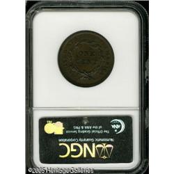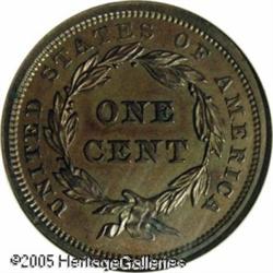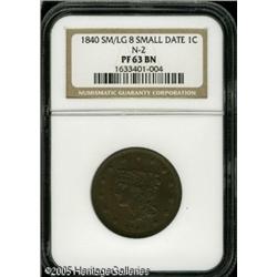 <B>1840 1C Small Over Large 18 PR63 Brown NGC.</B></I> N-2, R.2. R.6 in Proof. The most recent census information for this variety includes about 15 different examples in various grades, along with several older auction listings that probably represent duplication of currently known examples. This is a sharply struck proof with medium brown surfaces and lighter tan accents. The fields are moderately reflective and not deeply mirrored. Few abrasions, scratches, or other imperfections are noted. For the pedigree researcher, this example can easily be identified by a dark spot in the digit 4 and a small field mark below star 10. Only one example appears in the NGC Census as a N-2, although 10 other 1840 cents have been graded as Proofs by that service. All known Proof 1840 large cents are the N-2 variety. Lot:5170