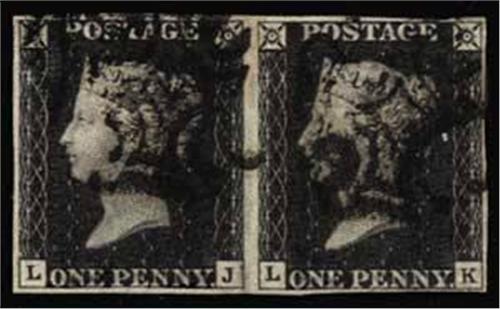 1840 1d plate 2: LJ-LK horiz pair, four margins with two black MC cancels