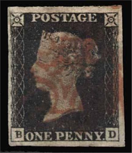 1840 1d plate 4: BD four margins part of adjoining stamp at top, red MC cancel