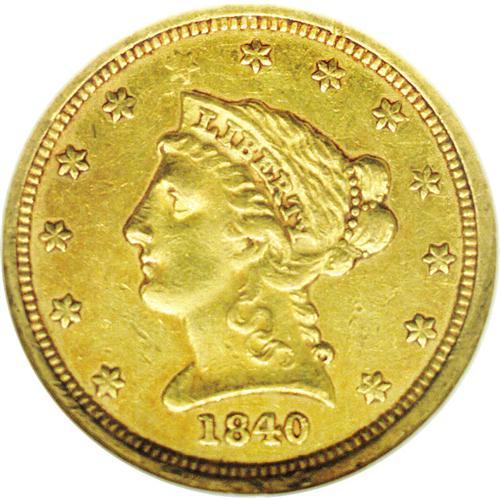 <B>1840<$2 1/2> AU55 NGC.</B></I> Still lustrous beneath attractive reddish patina. The obverse is well struck save for bluntness on star 6, while minor softness is also noticed on the eagle's neck and left (facing) leg. Popular as the initial year of issue for this long-lived series and a legitimate scarcity in AU and better grades. Census: 8 in 55, 20 finer (2/06).