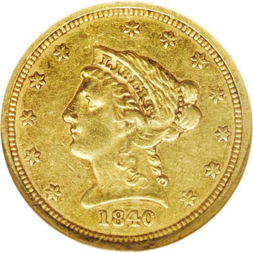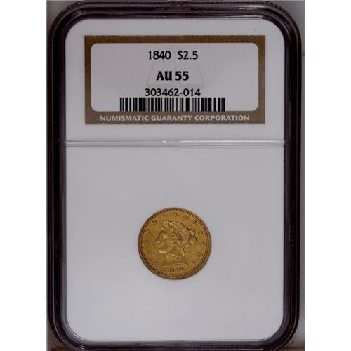 <B>1840 $2 1/2 AU55 NGC.</B></I> Still lustrous beneath attractive reddish patina. The obverse is well struck save for bluntness on star 6 while minor softness is also noticed on the eagle's neck and left (facing) leg. Popular as the initial year of issue for this long-lived series and a legitimate scarcity in AU and better grades. Census: 8 in 55, 20 finer (1/06).