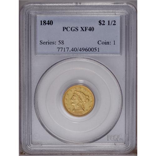 1840 $2 1/2 XF40 PCGS. A very scarce low mintage (18,8 1840[$2 1/2] XF40 PCGS.