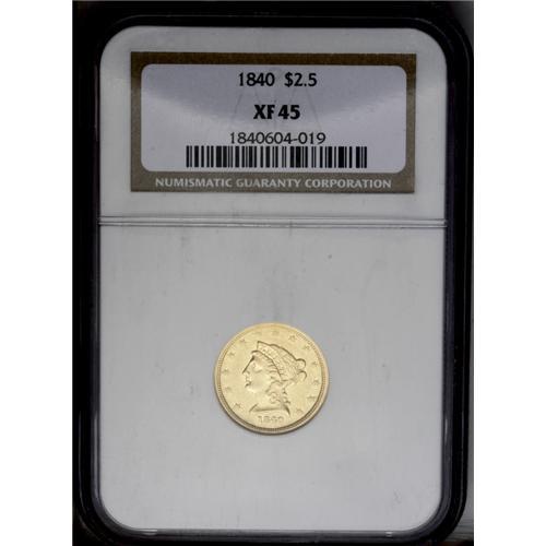 <B>1840<$2 1/2> XF45 NGC.</B></I> This introductory Liberty quarter eagle issue has a low production of 18,859 pieces. The present pale gold piece is nicely impressed on the portrait, although the eagle's legs and claws show softness. The bright surfaces are void of noticeable marks. Census: 17 in 45, 48 finer (6/06).