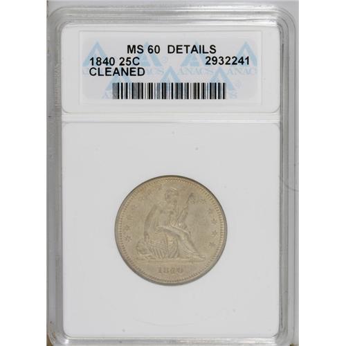 <B>1840 25C --Cleaned--ANACS. MS60 Details.</B></I> NGC Census: (0/8). PCGS Population (0/12). Mintage: 188,127. Numismedia Wsl. Price: $650. (#5397)<BR><BR><b>Shipping:</b> Coins & Currency (<a target="_blank" href="http://www.heritageauctions.com/common/shipping.php">view shipping information</a>)
