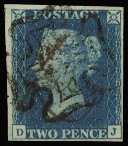1840 2d pale blue Plate 2: DJ (SG 6) four small to large margins, used by black mc and m/s annotation, cat £550