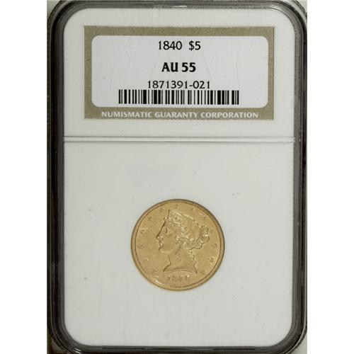 <B>1840 $5 AU55 NGC.</B></I> This appealing yellow-orange piece has only light, even wear and retains most of its original luster. Nicely struck with various handling marks.<BR><BR><b>Shipping:</b> Coin/Currency (<a target="_blank" href="http://www.heritageauctions.com/common/shipping.php">view shipping information</a>)