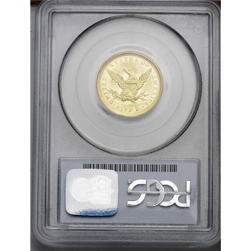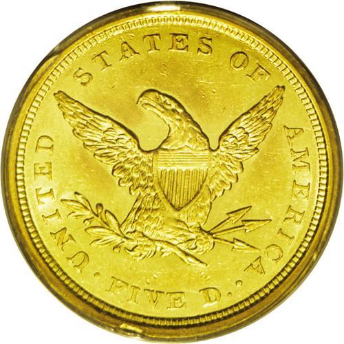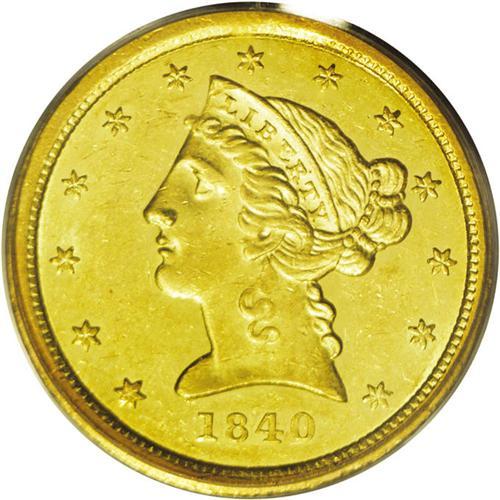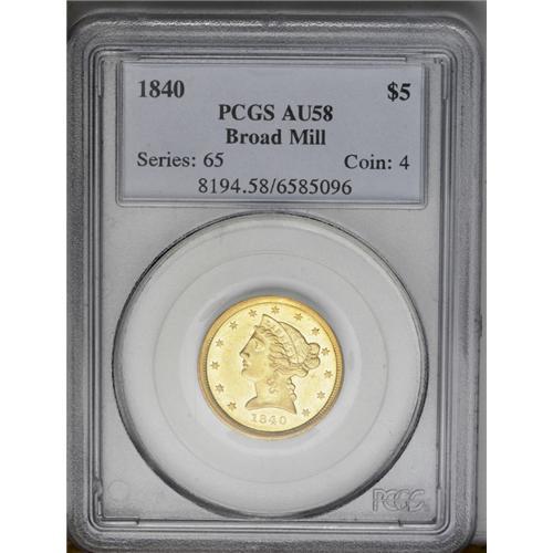 <B>1840<$5> Broad Mill AU58 PCGS.</B></I> Much scarcer than the Narrow Mill variety, the 1840 Broad Mill is a transitional issue. It has the wide rims of the 1839 issue, and the modified portrait of Liberty that first appeared in 1840. Although rub on the eyebrow, neck, and chin denies an Uncirculated grade, this bold example has no displeasing abrasions. Glimmers of original prooflike finish sparkle in the fields under a modest assortment of tiny bagmarks. Bright yellow-golden color overall.