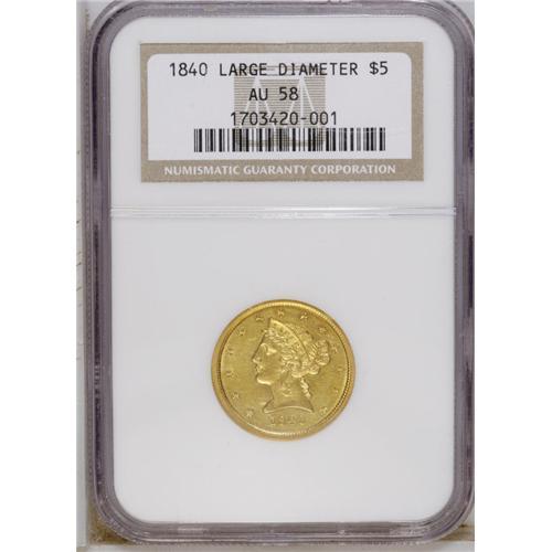 <B>1840 $5 Large Diameter AU58 NGC.</B></I> This bright yellow-gold five retains considerable luster. The design elements are well defined, and both sides reveal just a few minor marks.<BR><BR><b>Shipping:</b> Coin/Currency (<a target="_blank" href="http://www.heritageauctions.com/common/shipping.php">view shipping information</a>)