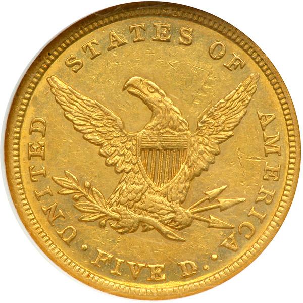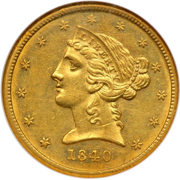 1840 $5 Liberty. NGC graded AU-58. Lightly toned with reflective surfaces. Notice the extremely choice quality of the portrait, with burt a single shallow mark under the lovelock curl and a faint chattermark above the right wing of the eagle. Well struck. Scarce (PCGS # 8194) .