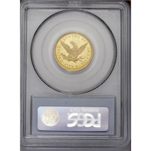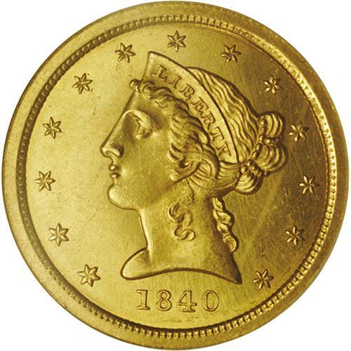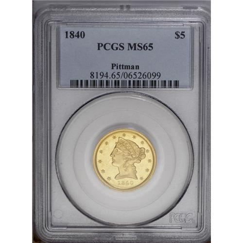 <B>1840<$5> MS65 NGC.</B></I> Ex: Pittman. Diameter: 22.3 mm. An amazing example of the Broad Mill or Large Diameter coinage, with a pedigree to match. The diameter is within the tolerance for the older Classic Head standard of 22.5 mm. During the year, standard diameter was reduced to 21.6 mm., after which the narrow mill coins were minted. The newly reduced diameter remained standard for the rest of the half eagle series through 1929. The Philadelphia Mint produced 137,382 half eagles during the year, although the distribution between the two varieties is not specifically known. Eventually, it may be the case that population data from the grading service might be a good indicator of production percentages. For example, NGC has certified a total of 35 examples of this date that have been properly attributed (along with 204 unattributed examples). Of those 35 pieces so identified, 25 are the broad mill coins and 10 are the narrow mill coins. These totals approximate 70% and 30% respectively, suggesting that not quite 100,000 of these were the broad mill coins.<BR> The two finest examples of this type that we know of are this coin, and the Mills-Clapp-Eliasberg example. This is the only Gem 1840 half eagle certified by PCGS, and is accompanied by similar MS65 grading label from NGC. Regardless of the population data currently reported, we believe this Gem example is the second finest known. We are in full agreement with David Akers' description of this coin: "Very sharply struck with full mint luster, a broad inner border, and gorgeous copper tinged yellow gold color. There are traces of a prooflike surface around the head of Liberty, and light striations throughout the fields running diagonally from upper left to lower right. A few light contact marks and abrasions are noted in the fields, none serious. There are what appear to be light file marks on the broad border and rim from the 1st to 3rd stars, and also from the 9th to the 12th stars. It is difficult to say for sure, but perhaps the edge was lightly filed to remove a partial wire rim. There are several small reverse rim nicks and also signs of apparent filing of the rim on the upper reverse above and slightly to the left and right of STATES OF." Two things must be mentioned: first, the light filing of the rim was most likely done at the Mint when this coin was struck, and second, this filing is so faint has to be more reminiscent of light hairlines. Neither NGC or PCGS was concerned about these marks in the least, for they both certified this same coin as a Gem MS65 example.<BR><I>Ex: Col. E.H.R. Green; King Farouk (Sotheby's, 2/1954), part of lot 249; John Jay Pittman (David Akers, 10/1997), lot 947.</B></I><BR><I>From The Larj Collection.</B></I>