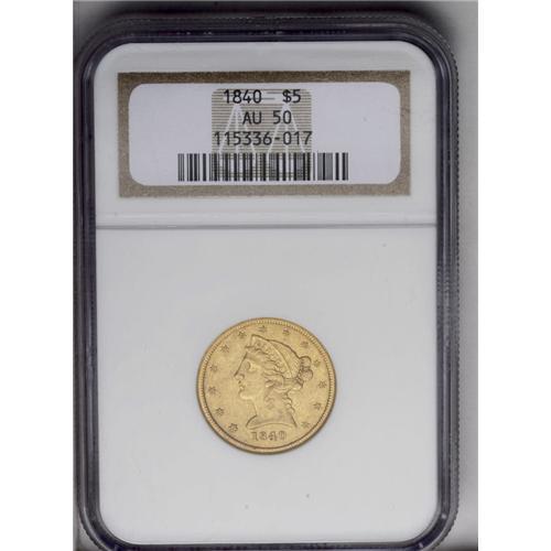 1840 $5 Narrow Mill AU50 NGC. A well struck example of 1840[$5] Narrow Mill AU50 NGC.