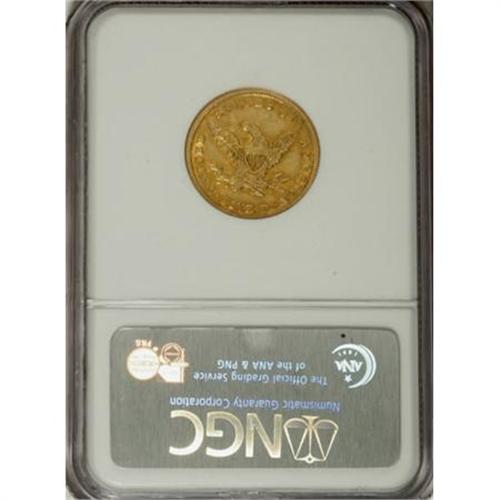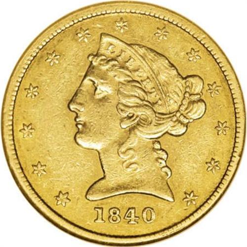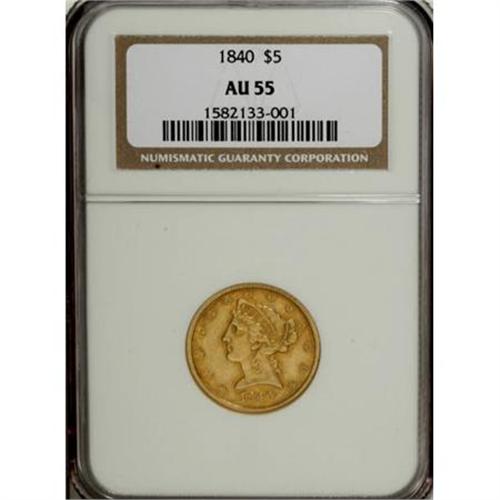 <B>1840 $5 Narrow Mill AU55 NGC.</B></I> Broad and Narrow Mill 1840 half eagles are easily distinguished by their physical diameter. The Broad Mill pieces are usually about 22.5 mm and the Narrow Mill are typically 21.6 mm. When these pieces are encountered in certification holders that fail to identify the variety, they are harder to attribute. Broad Mill pieces can also be identified by a wider than normal outer border on both sides.<BR> Narrow Mill pieces like this one are not quite as rare, but still desirable. Lightly abraded surfaces retain nearly full luster with medium yellow color and deeper honey-gold highlights. The strike is decent and the overall appearance is excellent.<BR><BR><B>Coin Engraver:</B> Christian Gobrecht<BR><BR><b>Shipping:</b> Coins & Currency (<a target="_blank" href="http://www.heritageauctions.com/common/shipping.php">view shipping information</a>\)