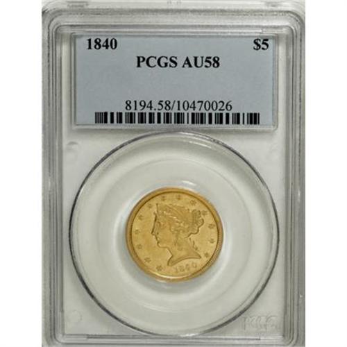 <B>1840 $5 Broad Mill AU58 PCGS.</B></I> Well struck aside from the curl below the ear. The obverse is pleasantly unabraded, while the reverse field exhibits hair-thin marks. Population: 14 in 58, 13 finer (8/07).<BR><BR><B>Coin Engraver:</B> Christian Gobrecht<BR><BR><b>Shipping:</b> Coins & Currency (<a target="_blank" href="http://www.heritageauctions.com/common/shipping.php">view shipping information</a>)