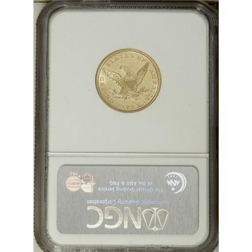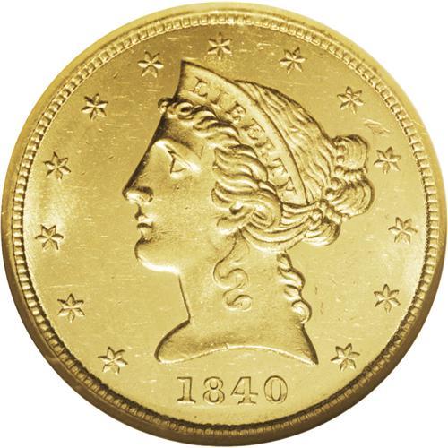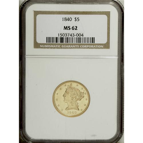 <B>1840 $5 Narrow Mill MS62 NGC.</B></I> A pretty yellow-gold example with some light abrasions and field chatter consistent with the MS62 grade, but also boasting much prooflikeness in the fields. While the Broad Mill variety is the more elusive of the two, any 1840 half eagle is rare and elusive in Mint State. Examples are much more frequently found in AU condition. Census: 4 in 62, 5 finer (10/06).<BR><BR><b>Shipping:</b> Coin/Currency (<a target="_blank" href="http://www.heritageauctions.com/common/shipping.php">view shipping information</a>)