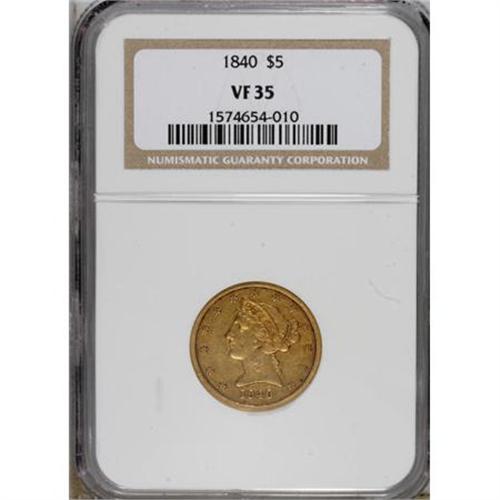 <B>1840 $5 Narrow Mill VF35 NGC.</B></I> NGC Census: (6/232). PCGS Population (9/135). Mintage: 137,300. Numismedia Wsl. Price for NGC/PCGS coin in VF35: $344. (#8194)<BR><BR><b>Shipping:</b> Coins & Currency (<a target="_blank" href="http://www.heritageauctions.com/common/shipping.php">view shipping information</a>)