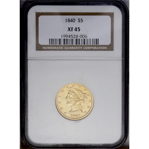 <B>1840<$5> Narrow Mill XF45 NGC.</B></I> Moderate circulation wear and a few light abrasions are seen on the pretty yellow-gold surfaces of this attractive and well struck early half eagle. <BR><BR><B>Important notice:</B> Heritage usually auctions material at the rate of 200-250 lots per hour. On some occasions eBay Live bid software or the Internet may not be able to keep up with the pace of the auction. We recommend placing a realistic absentee bid now as insurance to avoid disappointment. Occasionally the auctioneer may eliminate or reject an eBay Live bid, and the auctioneer may also reopen a lot after the close of the eBay live bidding (usually because we missed an audience bid), and may reject your bid even if it shows you as the winning bidder. By bidding via eBay Live, you agree that Heritage may award the lot to another bidder at its sole discretion under the circumstances described above or any other reasonable circumstances. Since eBay bids are not shown to us until we open the lot on the floor, we treat those bids just like floor bids. In most cases the floor responds before the eBay bid is presented to us, due to Internet lag time, so for consistency we have made it a policy that floor bids are always considered first over tie eBay live bids. Also please note that all Heritage lots purchased through eBay Live carry a 20% Buyer's Premium. Please make sure you read the Terms and Conditions before you bid. This lot is being auctioned in conjunction with a live floor auction by Heritage Galleries & Auctioneers. All final auction and invoice information will be supplied by Heritage Galleries & Auctioneers, and all other information should be considered preliminary. Lot:2654 <BR><BR><B>Winning Notification and Billing:</B> After the FINAL session in this auction is complete, Heritage will send e-mail and snail mail invoices. This process normally takes several days. All final auction and invoice information will be supplied by Heritage Galleries & Auctioneers, and all other information should be considered preliminary. <BR><BR>This auction will be conducted on a live auction floor and over the Internet through eBay Live. If you choose to place an absentee bid, please take a moment to <font color='#0000ff'><u><a href='http://pages.ebay.com/liveauctions/help/before/laabsentee.html'>learn how eBay Live absentee bidding works</a></u></font><font color='#000000'>
