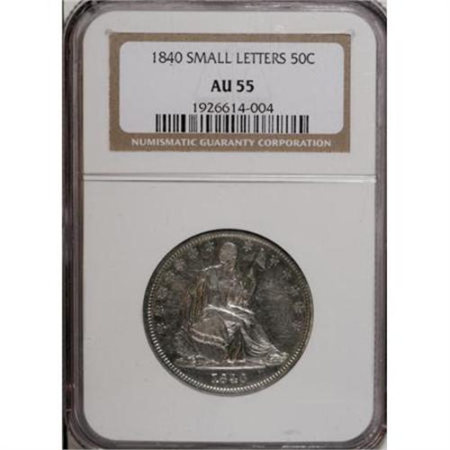 <B>1840 50C Reverse of 1839, Small Letters AU55 NGC.</B></I> NGC Census: (3/11). PCGS Population (18/80). Numismedia Wsl. Price for NGC/PCGS coin in AU55: $315. (#6233)<BR><BR><B>Coin Engraver:</B> Christian Gobrecht<BR><BR><b>Shipping:</b> Coins & Currency (<a target="_blank" href="http://www.heritageauctions.com/common/shipping.php">view shipping information</a>)