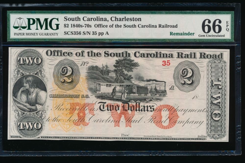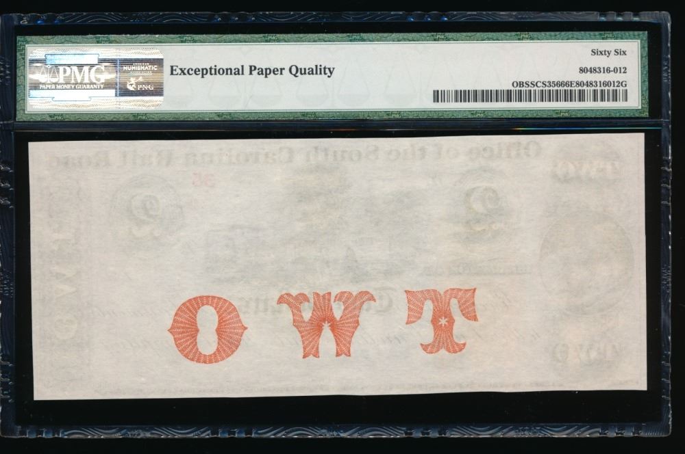 One 1840-70's $2 Charleston SC Obsolete PMG 66EPQ.