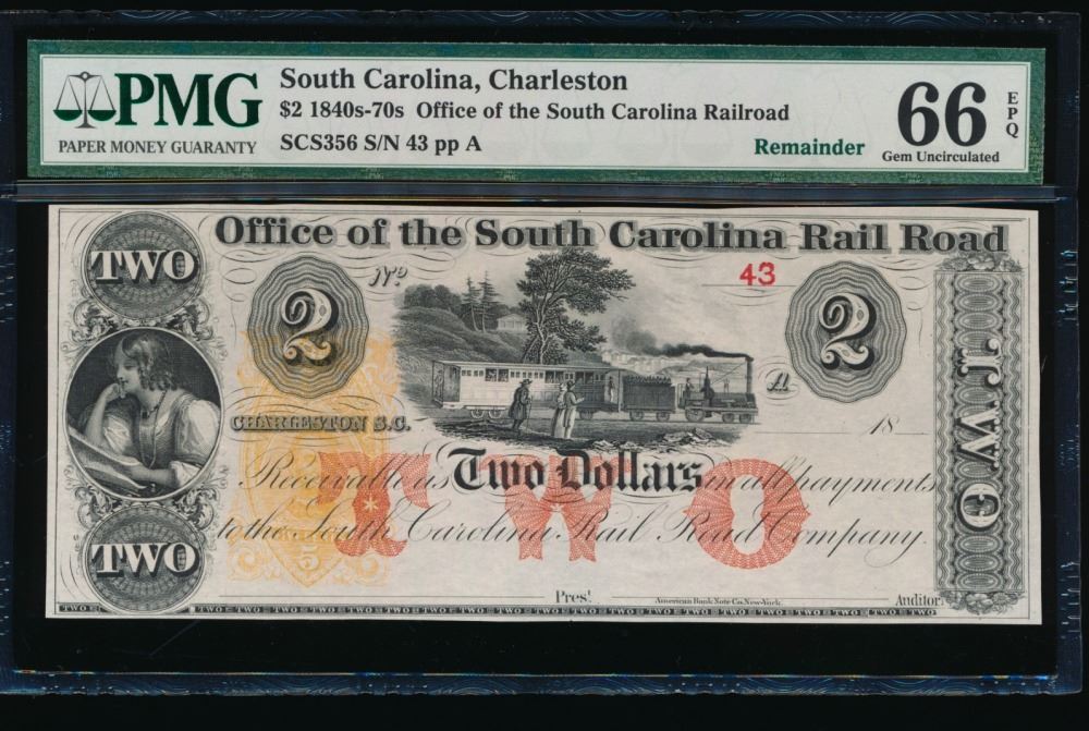 One 1840-70's $2 Charleston SC PMG 66EPQ.