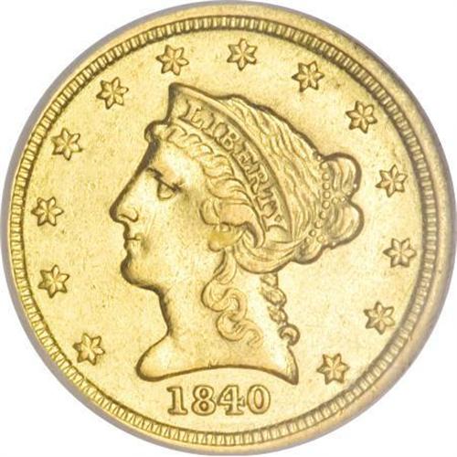 <B>1840-C $2 1/2 AU55 NGC.</B></I> Variety 1-A. This Choice AU specimen displays bright yellow-gold surfaces with traces of luster in the recessed areas. An attentive strike leaves sharp definition on the design elements, save for the typically soft hair at Liberty's ear. Light ticks distributed over each side do not disturb.<BR><BR><B>Coin Engraver:</B> Christian Gobrecht<BR><BR><b>Shipping:</b> Coins & Currency (<a target="_blank" href="http://www.heritageauctions.com/common/shipping.php">view shipping information</a>)