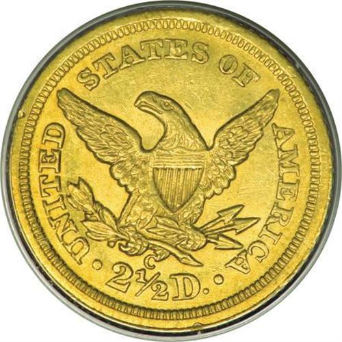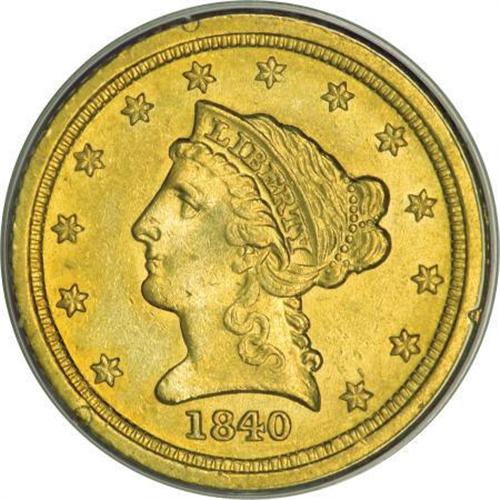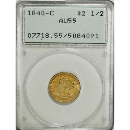 <B>1840-C $2 1/2 AU55 PCGS.</B></I> Variety 1-A. Quite well struck and an interesting comparison to the PCGS AU50 in this collection. This example has full detail in the centers and is sharp at the borders as well. The surfaces are clean and choice with just a few light marks seen in the fields. There are no hairlines or signs of cleaning and/or mishandling. The obverse retains a good deal of original luster while the reverse is nearly fully lustrous and would grade MS61 or so if rated on its own merits. There are splashes of rich green-gold color on the obverse; the reverse is more even in appearance with a pleasing green-gold shade. This is an attractive coin that would fit well into a high quality set of Charlotte quarter eagles. Housed in an old PCGS holder, the coin appears conservatively graded by today's standards.<BR><I>From The Carolina Circle Collection.</B></I><BR><BR><B>Coin Engraver:</B> Christian Gobrecht<BR><BR><b>Shipping:</b> Coins & Currency (<a target="_blank" href="http://www.heritageauctions.com/common/shipping.php">view shipping information</a>)