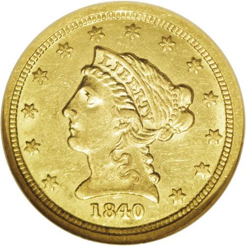 <B>1840-C $2 1/2 AU58 NGC.</B></I> Variety 1-A. A popular issue, not only for its status as the first year of the Gobrecht design, but for its above-average strike and luster. This near-Mint example does not disappoint. The lemon-gold fields retain plenty of flash, and aside from a touch of softness and friction at the obverse highpoints, the detail is sharp. Census: 20 in 58, 12 finer (12/06).<BR><BR><b>Shipping:</b> Coin/Currency (<a target="_blank" href="http://www.heritageauctions.com/common/shipping.php">view shipping information</a>)