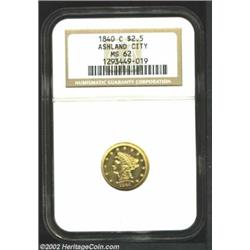 1840-C $2 1/2 MS62 NGC. Winter 1-A. The 1840-C is a moderately scarce Charlotte Quarter Eagle, but in Mint State it is unquestionably rare. At the MS62 level, this is a lower Condition Census example. Sharply struck throughout, this piece has bright yellow-gold color with flashy, semi-prooflike fields. A few light abrasions are scattered about, the most obvious one for pedigree purposes is a small dig in the field in front of Liberty's hair.From the Ashland City Collection. Important notice: We expect to be auctioning lots at the rate of 200-250 per hour. Sometimes eBay Premier live bid software cannot keep up with that pace, so we strongly recommend that you place a realistic proxy bid now as insurance to avoid disappointment. Also please note that all Heritage/CAA lots purchased through eBay Premier carry a 20% Buyer's Premium. Please make sure you read the Terms and Conditions.