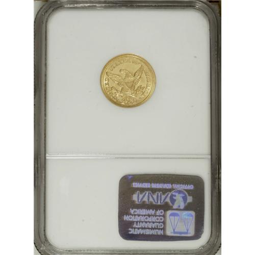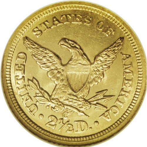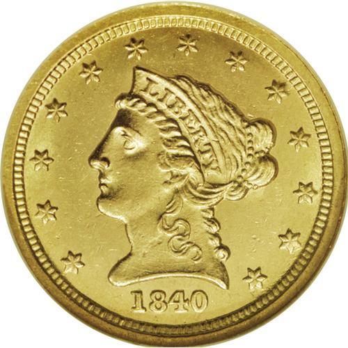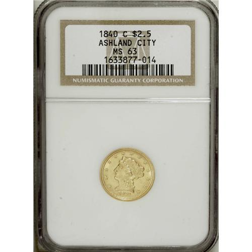 <B>1840-C $2 1/2 MS63 NGC.</B></I> Variety 1-A. At the MS63 level, this piece is tied with seven others at the top of the list of currently graded examples at NGC and PCGS combined. This is a very impressive coin. The striking details are well brought up on each side with no obvious areas of weakness. The flashy green-gold surfaces exhibit a strong semi-prooflike sheen in the fields with satiny mint luster intermixed. Fortunately (or unfortunately, depending upon one's point of view), there are no singular marks on either side that can be pointed to as a reliable pedigree identifier. Census: 3 in 63, 0 finer (11/06).<BR><BR><b>Shipping:</b> Coin/Currency (<a target="_blank" href="http://www.heritageauctions.com/common/shipping.php">view shipping information</a>)