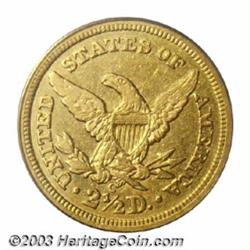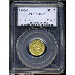 <table><tr><td><TABLE cellSpacing=0 cellPadding=0 width="100%" bgColor=#000000 border=0><TBODY> <TR><TD width="100%"><TABLE cellSpacing=1 cellPadding=3 width="100%" border=0><TBODY><TR><TD width="100%" bgColor=#79735c><FONT face=arial color=#ffffff size=3><B>Description</B> </FONT></TD></TR><TR><TD width="100%" bgColor=#ffffff><FONT face=arial size=2><B>1840-C $2 1/2 XF45 PCGS.</B></I> Winter 1-A. Vibrant green-gold surfaces with few appreciable surfaces and much luster adhering to the devices. The premier C-mint issue of the Coronet type and a scarcity in all grades, from a mintage of just 12,822 pieces.<BR><I>From The New Millennium Collection.</B></I> </FONT></TD></TR></TBODY></TABLE></TD></TR></TBODY></TABLE><BR><A name=PricesRealized></A><TABLE cellSpacing=0 cellPadding=0 width="100%" bgColor=#000000 border=0><TBODY><TR><TD width="100%"><TABLE cellSpacing=1 cellPadding=3 width="100%" border=0><TBODY><TR><TD width="100%" bgColor=#79735c><A name=PR><FONT face=arial color=#ffffff size=3><B>Previous Prices from Heritage Auctions</B> </FONT></A></TD></TR><TR><TD bgColor=#f6f6ed><TABLE cellSpacing=0 cellPadding=0 width="100%" border=1><TBODY><TR><TD align=middle width="33%"><B>Date</B></TD><TD align=middle width="33%"><B>Service</B></TD><TD align=middle width="33%"><B>Price</B></TD></TR><TR bgColor=whitesmoke><TD width="33%"><B>04/14/2000</B></TD><TD width="33%">PCGS</TD><TD width="33%">$2,012.50</TD></TR><TR bgColor=whitesmoke><TD width="33%"><B>08/02/1997</B></TD><TD width="33%">PCGS</TD><TD width="33%">$1,667.50</TD></TR><TR bgColor=whitesmoke><TD width="33%"><B>11/01/1996</B></TD><TD width="33%">PCGS</TD><TD width="33%">$1,650.00</TD></TR></TBODY></TABLE></TD></TR><TR><TD bgColor=#ffffff><FONT face=arial size=1 ?>PLEASE NOTE: All prices realized reflect the final hammer price PLUS the buyer's premium in auctions that charge a buyer's premium. Each item has a notation at the top of the listing indicating whether that lot included a buyer's premium. Example: A item that sells with a final hammer price of $100 and a 20% buyer's premium will display with a price realized of $120. All information listed is intended to be as accurate as possible, but errors are possible. Please use this guide carefully and inform us of any inaccuracies. </FONT></TD></TR></TBODY></TABLE></TD></TR></TBODY></TABLE><BR><TABLE cellSpacing=0 cellPadding=0 width="100%" bgColor=#000000 border=0><TBODY><TR><TD width="100%"><TABLE cellSpacing=1 cellPadding=3 width="100%" border=0><TBODY><TR><TD width="100%" bgColor=#79735c colSpan=6><FONT face=arial color=#ffffff size=3><B>Price Guide*</B> </FONT></TD></TR><TR bgColor=#f6f6ed><TD align=middle><B>Grade</B> </TD><TD align=middle><B>Coin World<BR>(Trends)</B> </TD><TD align=middle><B>Numismedia<BR>Retail</B> </TD><TD align=middle><B>Numismedia<BR>Wholesale</B> </TD><TD align=middle><B>Coin<BR>Universe</B> </TD><TD align=middle><B>Heritage<BR>Value Index</B> </TD></TR><TR bgColor=#ffffff><TD align=middle>40</TD><TD align=right>$1,800.00</TD><TD align=right>---</TD><TD align=right>$1,750.00</TD><TD align=right>$1,375.00</TD><TD align=right>$1,070.83</TD></TR><TR style="FONT-WEIGHT: bold" bgColor=#cccfdd><TD align=middle>45</TD><TD align=right>$2,500.00</TD><TD align=right>---</TD><TD align=right>---</TD><TD align=right>---</TD><TD align=right>$1,824.72</TD></TR><TR bgColor=#ffffff><TD align=middle>50</TD><TD align=right>$4,500.00</TD><TD align=right>---</TD><TD align=right>$3,775.00</TD><TD align=right>---</TD><TD align=right>$2,881.94</TD></TR><TR bgColor=#ffffff><TD colSpan=6><FONT size=1>*All information listed is intended to be as accurate as possible, but errors are possible. No item may be returned or refused based on this information which is provided as a service to our customers. You should contact each pricing source directly to determine the accuracy of this information. </FONT></TD></TR></TBODY></TABLE></TD></TR></TBODY></TABLE><BR><TABLE cellSpacing=0 cellPadding=0 width="100%" bgColor=#000000 border=0><TBODY><TR><TD width="100%"><TABLE cellSpacing=1 cellPadding=3 width="100%" border=0><TBODY><TR><TD width="100%" bgColor=#79735c><FONT face=arial color=#ffffff size=3><B>Population Guide</B> </FONT></TD></TR><TR bgColor=#ffffff><TD align=middle><!-- Begin Output of Population Grid--><TABLE cellSpacing=0 cellPadding=0 width="100%" border=0><TBODY><TR><TD vAlign=center><TABLE cellSpacing=0 width="100%" border=1 cellsadding="3"><TBODY><TR><TD vAlign=center><TABLE cellSpacing=0 cellPadding=3 width="100%" border=1><TBODY><TR><TD vAlign=center align=middle bgColor=#f0f1e8 colSpan=2 <CENTER><FONT face=Arial size=2><B>PCGS Pop </B></FONT><CENTER></CENTER></TD><TD vAlign=center align=middle bgColor=#f0f1e8 colSpan=2><CENTER><FONT face=Arial size=2><B>NGC Pop</B></CENTER></FONT></TD></TR><TR><TD vAlign=center><FONT face=Arial size=2>(45)</FONT> </TD><TD vAlign=center align=right><FONT face=Arial size=2>12</FONT> </TD><TD vAlign=center><FONT face=Arial size=2>(45)</FONT> </TD><TD vAlign=center align=right><FONT face=Arial size=2>13</FONT> </TD></TR><TR><TD vAlign=center><FONT face=Arial size=2>(>45)</FONT> </TD><TD vAlign=center align=right><FONT face=Arial size=2>42</FONT> </TD><TD vAlign=center><FONT face=Arial size=2>(>45)</FONT> </TD><TD vAlign=center align=right><FONT face=Arial size=2>54</FONT> </TD></TR></TBODY></TABLE></TD></TR></TBODY></TABLE></TD></TR></TBODY></TABLE><!-- End Output of Population Grid--></TD></TR></TBODY></TABLE></TD></TR></TBODY></TABLE><BR><TABLE cellSpacing=0 cellPadding=0 width="100%" bgColor=#000000 border=0><TBODY><TR> Important notice: Heritage usually auctions material at the rate of 200-250 lots per hour. On some occasions eBay Live bid software or the Internet may not be able to keep up with the pace of the auction. We recommend placing a realistic absentee bid now as insurance to avoid disappointment. Occasionally the auctioneer may eliminate or reject an eBay Live bid, and the auctioneer may also reopen a lot after the close of the e
