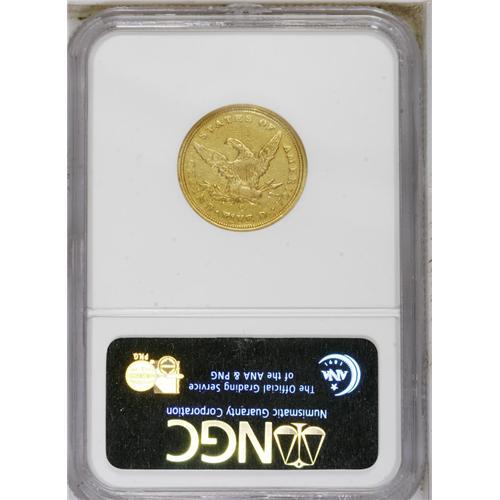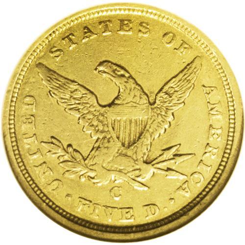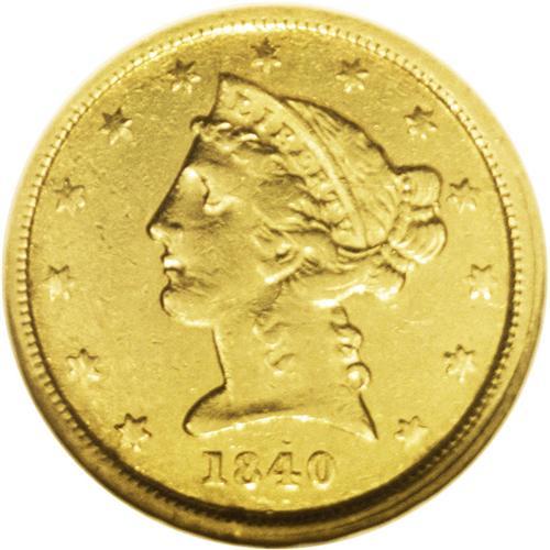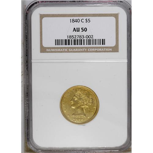 <B>1840-C $5 AU50 NGC.</B></I> Variety 2-B. Glimmering luster emerges from the devices and borders of this rare but collectible Southern gold issue. The strike is typical, with intermittent softness on the stars and curls, although the eagle's wings are crisp. Moderately abraded and glossy with a few unimportant peripheral strike-throughs, as made. A scant 18,992 pieces were struck. Census: 6 in 50, 25 finer (9/06).<BR><BR><b>Shipping:</b> Coin/Currency (<a target="_blank" href="http://www.heritageauctions.com/common/shipping.php">view shipping information</a>)
