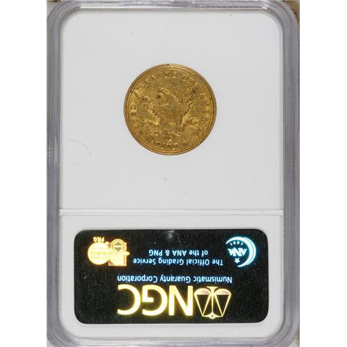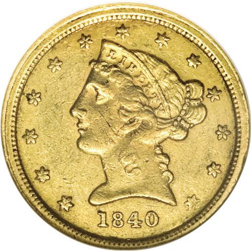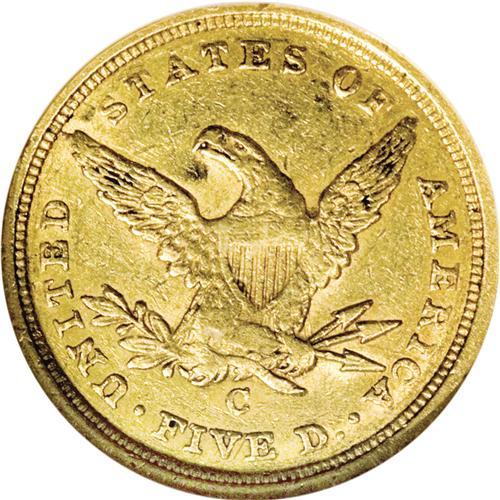<B>1840-C $5 AU58 NGC.</B></I> Variety 2-B, Die State I. A rare and illustrious issue, one that has been noted for many years for its elusiveness. Winter calls it the second rarest of all C-mint half eagles, behind only the 1842-C Small Date. The 1840-C is also the first issue struck with the C mintmark on the reverse, rather than the obverse. In this die state, the reverse die crack from the rim to the I in AMERICA is as yet unformed. This medium yellow-gold piece shows a typically weak strike through the centers, with softness noted on Liberty's hair highpoints and on the shield, the eagle's neck, and the upper legs and fletchings. Yet much luster resides on the surfaces, and there are no major planchet irregularities, unlike so many coins of this issue. Garrett and Guth note, "An example of the 1840-C in About Uncirculated must be considered rare." Census: 7 in 58, 4 finer (3/07).<BR><BR><b>Shipping:</b> Coins & Currency (<a target="_blank" href="http://www.heritageauctions.com/common/shipping.php">view shipping information</a>)