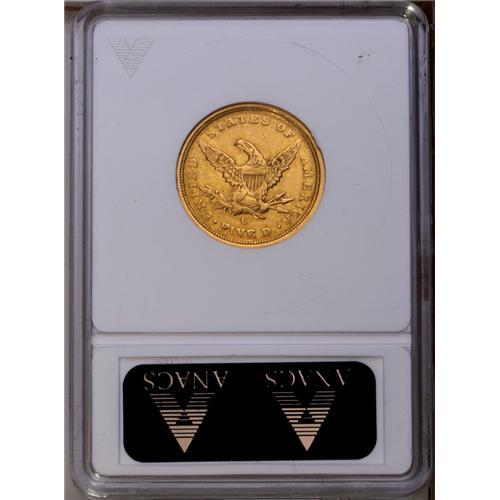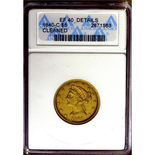 <B>1840-C<$5>--Cleaned--ANACS. XF40 Details.</B></I> Variety 2 Obverse, Reverse Unlisted. This very scarce coin has unnaturally bright yellow-gold surfaces from cleaning. Handling marks and hairlines, neither as negative as might be expected, appear on both sides.