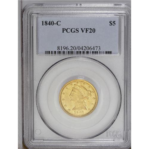 <B>1840-C<$5> VF20 PCGS.</B></I> Variety 2-B, Die State II. The later die state is indicated by a die crack extending from the rim through the I of AMERICA to the middle arrowhead. Both sides exhibit typical softness in the centers and are framed in green-gold patina, with peach accents on some of the highpoints. Typically worn with adequate remaining design details for the assigned grade level. Scarcer in all grades than the more heralded Charlotte half eagles from 1838 and 1839.<BR><I>From The Carolina Gold Collection, Part Three.</B></I>