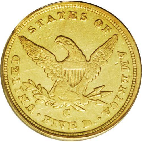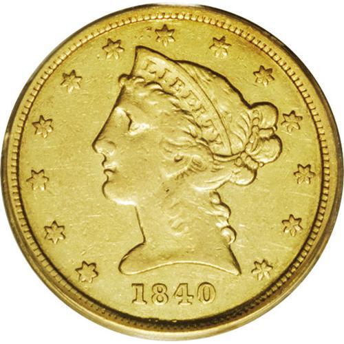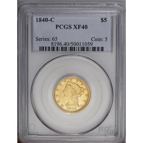 <B>1840-C $5 XF40 PCGS.</B></I> Variety 2-B, Die State I, lacking the die crack through I in AMERICA. The 1840-C is a major overall rarity as well as condition rarity among Charlotte half eagles. Even though 18,956 pieces were struck, very few remain today above XF condition. This piece shows the typical weakness on each side, and there are numerous small to medium-sized abrasions scattered about. The only mark worthy of note is a vertical scrape in the upper reverse field. The surfaces are bright with a significant overlay of reddish patina.