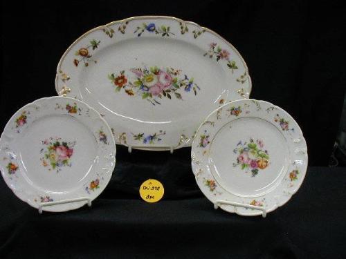 1840 CONTINENTAL PORC. HND. PTD. FLORAL & GOLD ACCENTS INCLUDES (1) 15 1/4in OVAL PLATTER (W/HAIRLINE) & (2) MATCHING 8in PLATES EXCELLENT, 3 PC