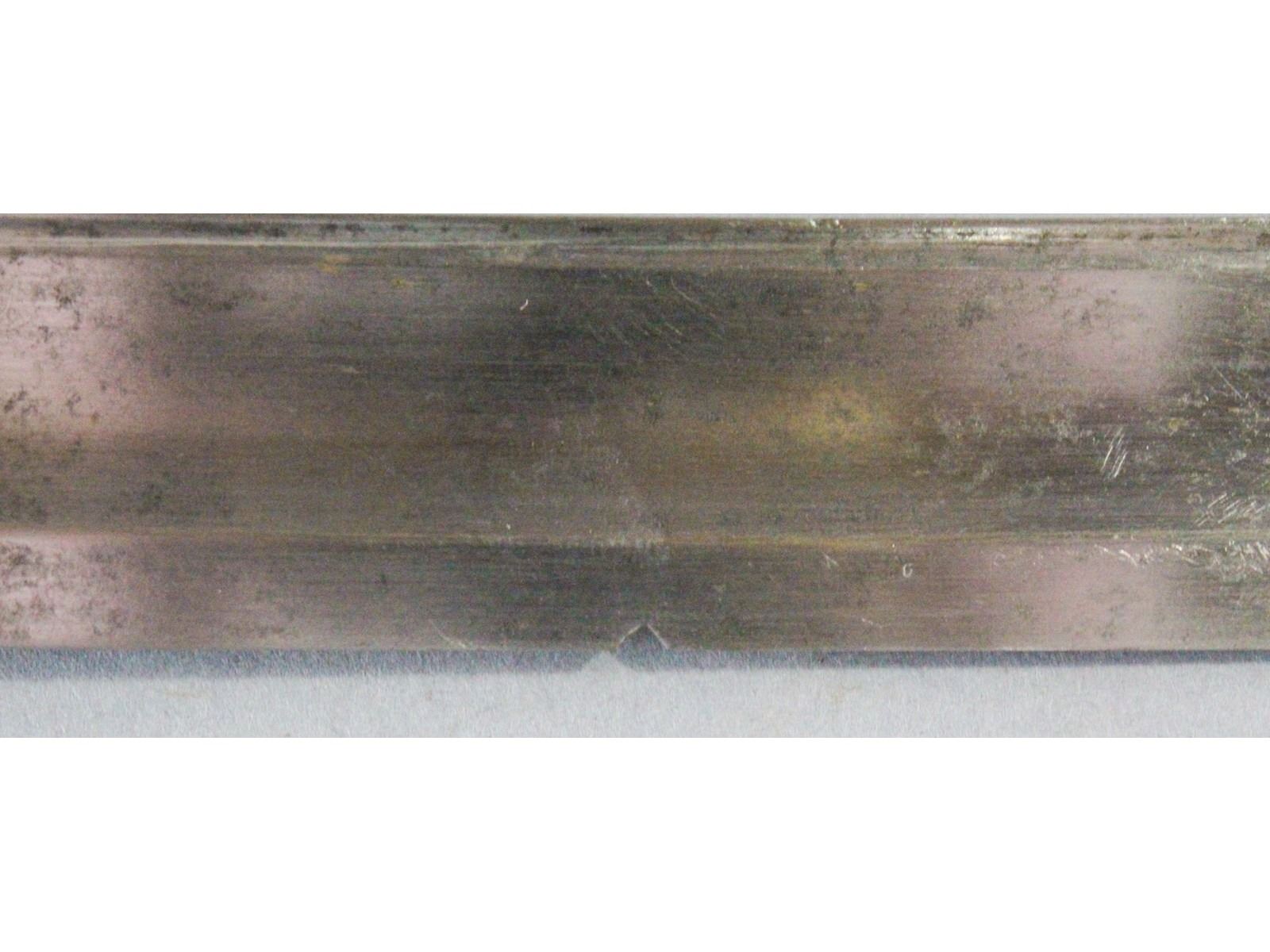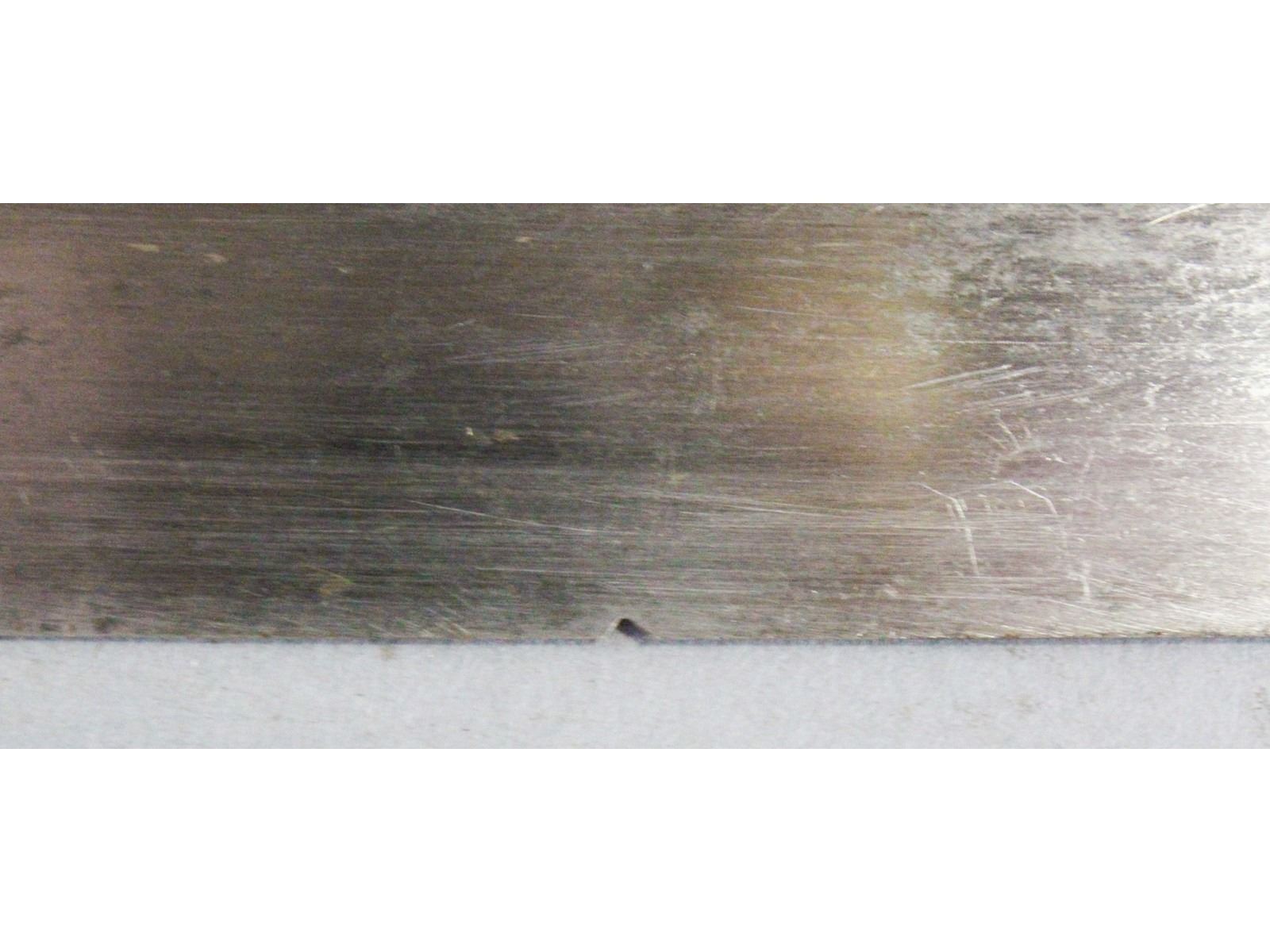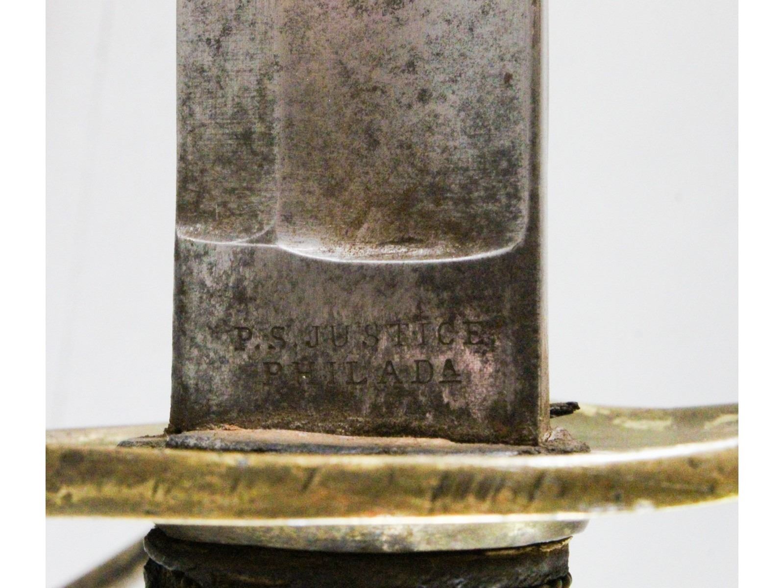 PS Justice, Philadelphia Blade may have been cleaned. Has a couple small nicks. Leather and wire grip is good. Scabbard has no dents but may have been replated at some point.