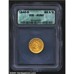 1840-D $2 1/2 AU50 ICG.<p>This piece shows typical striking characteristics with soft definition on Liberty's hair curls, the peripheral stars, and the eagle's plumage. The surfaces are light in hue and faint remnants of luster remain. A rare opportunity to acquire a representative of this early Dahlonega issue in high grade. Important notice: We expect to be auctioning lots at the rate of 200-250 per hour. Sometimes eBay Premier live bid software cannot keep up with that pace, so we strongly recommend that you place a realistic proxy bid now as insurance to avoid disappointment. Also please note that all Heritage/CAA lots purchased through eBay Premier carry a 20% Buyer's Premium.