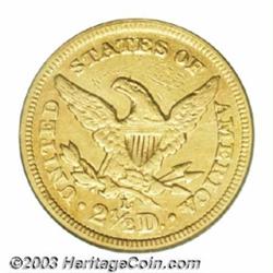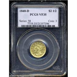 <table><tr><td><TABLE cellSpacing=0 cellPadding=0 width="100%" bgColor=#000000 border=0><TBODY> <TR><TD width="100%"><TABLE cellSpacing=1 cellPadding=3 width="100%" border=0><TBODY><TR><TD width="100%" bgColor=#79735c><FONT face=arial color=#ffffff size=3><B>Description</B> </FONT></TD></TR><TR><TD width="100%" bgColor=#ffffff><FONT face=arial size=2><B>1840-D $2 1/2 VF35 PCGS.</B></I> Winter 1-A, First Edition. The 1840-D Quarter Eagle, one of just 3,532 pieces struck in the first year of Coronet design, is not only one of the keys to the Dahlonega Quarter Eagle series, it is also one of the dozen or so rarest issues in the entire, lengthy series. This borderline XF representative displays bright green-gold and reddish surfaces with often-seen die cracks on both sides from advanced or stressful use of the dies.<BR><I>From The New Millennium Collection.</B></I> </FONT></TD></TR></TBODY></TABLE></TD></TR></TBODY></TABLE><BR><A name=PricesRealized></A><TABLE cellSpacing=0 cellPadding=0 width="100%" bgColor=#000000 border=0><TBODY><TR><TD width="100%"><TABLE cellSpacing=1 cellPadding=3 width="100%" border=0><TBODY><TR><TD width="100%" bgColor=#79735c><A name=PR><FONT face=arial color=#ffffff size=3><B>Previous Prices from Heritage Auctions</B> </FONT></A></TD></TR><TR><TD bgColor=#f6f6ed><TABLE cellSpacing=0 cellPadding=0 width="100%" border=1><TBODY><TR><TD align=middle width="33%"><B>Date</B></TD><TD align=middle width="33%"><B>Service</B></TD><TD align=middle width="33%"><B>Price</B></TD></TR><TR bgColor=whitesmoke><TD width="33%"><B>11/01/1998</B></TD><TD width="33%">PCGS</TD><TD width="33%">$9,775.00</TD></TR><TR bgColor=whitesmoke><TD width="33%"><B>10/01/1995</B></TD><TD width="33%">PCGS</TD><TD width="33%">$1,815.00</TD></TR></TBODY></TABLE></TD></TR><TR><TD bgColor=#ffffff><FONT face=arial size=1 ?>PLEASE NOTE: All prices realized reflect the final hammer price PLUS the buyer's premium in auctions that charge a buyer's premium. Each item has a notation at the top of the listing indicating whether that lot included a buyer's premium. Example: A item that sells with a final hammer price of $100 and a 20% buyer's premium will display with a price realized of $120. All information listed is intended to be as accurate as possible, but errors are possible. Please use this guide carefully and inform us of any inaccuracies. </FONT></TD></TR></TBODY></TABLE></TD></TR></TBODY></TABLE><BR><TABLE cellSpacing=0 cellPadding=0 width="100%" bgColor=#000000 border=0><TBODY><TR><TD width="100%"><TABLE cellSpacing=1 cellPadding=3 width="100%" border=0><TBODY><TR><TD width="100%" bgColor=#79735c colSpan=6><FONT face=arial color=#ffffff size=3><B>Price Guide*</B> </FONT></TD></TR><TR bgColor=#f6f6ed><TD align=middle><B>Grade</B> </TD><TD align=middle><B>Coin World<BR>(Trends)</B> </TD><TD align=middle><B>Numismedia<BR>Retail</B> </TD><TD align=middle><B>Numismedia<BR>Wholesale</B> </TD><TD align=middle><B>Coin<BR>Universe</B> </TD><TD align=middle><B>Heritage<BR>Value Index</B> </TD></TR><TR bgColor=#ffffff><TD align=middle>30</TD><TD align=right>---</TD><TD align=right>---</TD><TD align=right>---</TD><TD align=right>$2,100.00</TD><TD align=right>$2,988.13</TD></TR><TR style="FONT-WEIGHT: bold" bgColor=#cccfdd><TD align=middle>35</TD><TD align=right>---</TD><TD align=right>---</TD><TD align=right>---</TD><TD align=right>---</TD><TD align=right>$4,347.50</TD></TR><TR bgColor=#ffffff><TD align=middle>40</TD><TD align=right>$9,000.00</TD><TD align=right>---</TD><TD align=right>$7,250.00</TD><TD align=right>$7,500.00</TD><TD align=right>$5,650.00</TD></TR><TR bgColor=#ffffff><TD colSpan=6><FONT size=1>*All information listed is intended to be as accurate as possible, but errors are possible. No item may be returned or refused based on this information which is provided as a service to our customers. You should contact each pricing source directly to determine the accuracy of this information. </FONT></TD></TR></TBODY></TABLE></TD></TR></TBODY></TABLE><BR><TABLE cellSpacing=0 cellPadding=0 width="100%" bgColor=#000000 border=0><TBODY><TR><TD width="100%"><TABLE cellSpacing=1 cellPadding=3 width="100%" border=0><TBODY><TR><TD width="100%" bgColor=#79735c><FONT face=arial color=#ffffff size=3><B>Population Guide</B> </FONT></TD></TR><TR bgColor=#ffffff><TD align=middle><!-- Begin Output of Population Grid--><TABLE cellSpacing=0 cellPadding=0 width="100%" border=0><TBODY><TR><TD vAlign=center><TABLE cellSpacing=0 width="100%" border=1 cellsadding="3"><TBODY><TR><TD vAlign=center><TABLE cellSpacing=0 cellPadding=3 width="100%" border=1><TBODY><TR><TD vAlign=center align=middle bgColor=#f0f1e8 colSpan=2 <CENTER><FONT face=Arial size=2><B>PCGS Pop </B></FONT><CENTER></CENTER></TD><TD vAlign=center align=middle bgColor=#f0f1e8 colSpan=2><CENTER><FONT face=Arial size=2><B>NGC Pop</B></CENTER></FONT></TD></TR><TR><TD vAlign=center><FONT face=Arial size=2>(35)</FONT> </TD><TD vAlign=center align=right><FONT face=Arial size=2>4</FONT> </TD><TD vAlign=center><FONT face=Arial size=2>(35)</FONT> </TD><TD vAlign=center align=right><FONT face=Arial size=2>2</FONT> </TD></TR><TR><TD vAlign=center><FONT face=Arial size=2>(>35)</FONT> </TD><TD vAlign=center align=right><FONT face=Arial size=2>33</FONT> </TD><TD vAlign=center><FONT face=Arial size=2>(>35)</FONT> </TD><TD vAlign=center align=right><FONT face=Arial size=2>19</FONT> </TD></TR></TBODY></TABLE></TD></TR></TBODY></TABLE></TD></TR></TBODY></TABLE><!-- End Output of Population Grid--></TD></TR></TBODY></TABLE></TD></TR></TBODY></TABLE><BR><TABLE cellSpacing=0 cellPadding=0 width="100%" bgColor=#000000 border=0><TBODY><TR> Important notice: Heritage usually auctions material at the rate of 200-250 lots per hour. On some occasions eBay Live bid software or the Internet may not be able to keep up with the pace of the auction. We recommend placing a realistic absentee bid now as insurance to avoid disappointment. Occasionally the auctioneer may eliminate or reject an eBay