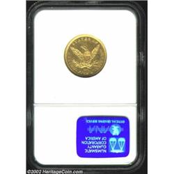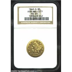 1840-D $5 Narrow Mill MS61 NGC. Winter 3-B. The design of Liberty was modified slightly in 1840 to the design it would retain until 1908. However, in this first year two diameters were used. This is the more frequently encountered Narrow Rim variant. Only 85-95 pieces are known today in all grades out of the original mintage of 22,896 pieces. A mere 4-5 Mint State coins are believed extant with this piece tied with the North Georgia coin as fourth finest. The surfaces lack the often-seen planchet laminations that are so often encountered. Both obverse and reverse are peppered with numerous small abrasions that account for the grade, the most obvious of which are shallow, light pinscratching below the date and a field mark below the E in STATES. The surfaces are bright orange-gold and the fields are semi-reflective with some satiny luster intermixed.From the Ashland City Collection. Important notice: We expect to be auctioning lots at the rate of 200-250 per hour. Sometimes eBay Premier live bid software cannot keep up with that pace, so we strongly recommend that you place a realistic proxy bid now as insurance to avoid disappointment. Also please note that all Heritage/CAA lots purchased through eBay Premier carry a 20% Buyer's Premium. Please make sure you read the Terms and Conditions.