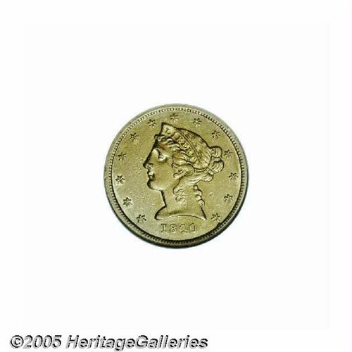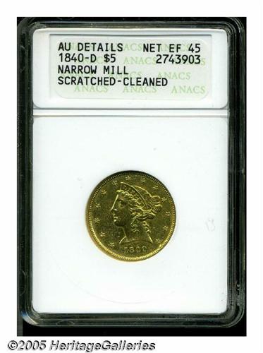 <B>1840-D<$5> Narrow Mill--Scratched, Cleaned--ANACS. AU Details, Net XF45.</B></I> Variety 3-B. The Tall Mintmark variety, the mintmark has a more delicate outline and a wider opening than on its Small Mintmark counterpart. The surfaces have been obviously polished and a few marks and scratches are noted on each side. Just 22,896 pieces were struck.