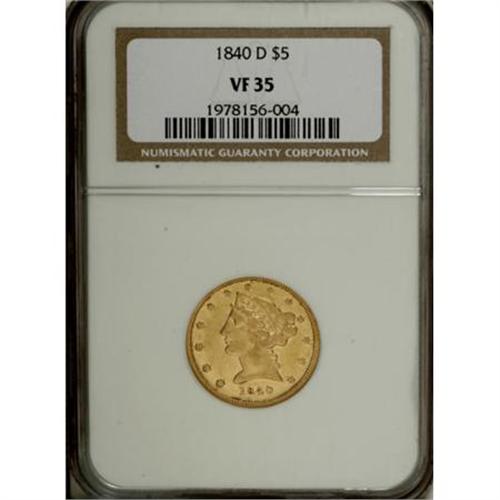 <B>1840-D $5 Small D VF35 NGC.</B></I> Variety 4-C. The Small Mintmark variety with diagnostic die crack extending from the arrow feather to the D. Scarcer than the Tall D variety. Douglas Winter, in his Dahlonega Mint gold coins reference, says "This variety appears to be rare." Peach-gold surfaces on this VF35 example reveal hints of luster in some of the protected areas. Nice detail, and a minimum of contact marks.<BR><BR><b>Shipping:</b> Coins & Currency (<a target="_blank" href="http://www.heritageauctions.com/common/shipping.php">view shipping information</a>)