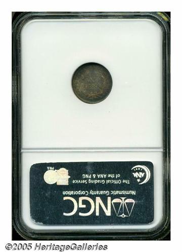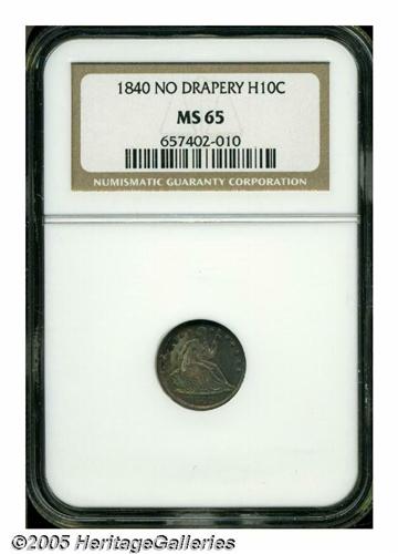 <B>1840<H10C> No Drapery MS65 NGC.</B></I> Splendid apple-green, gold, and russet hues embrace this well struck early Seated Half Dime. A light horizontal mark beneath HALF prevents a greater grade. Population: 18 in 65, 20 finer (5/05).