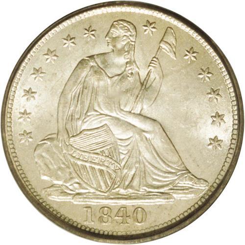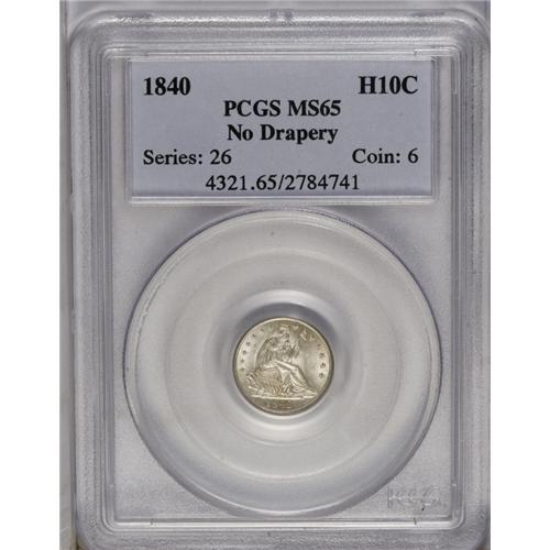 <B>1840<H10C> No Drapery MS65 PCGS.</B></I> Silver-gray frosty surfaces exhibit glowing luster and crisply struck devices. Well preserved despite delicate contact on the right obverse field. The Stars, No Drapery subtype was only struck between 1838 and 1840. Circulated examples are plentiful, but Gems are undeniably scarce. Population: 18 in 65, 16 finer (5/06).