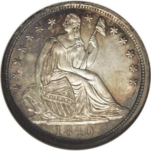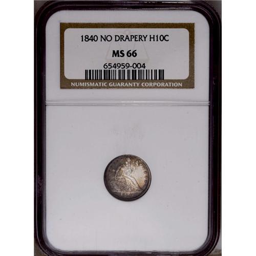 <B>1840<H10C> No Drapery MS66 NGC.</B></I> A window of brilliance illuminates the central-right obverse, while the remainder of this splendid premium Gem displays luxurious golden-brown, plum, and blue-green colors. A meticulously struck and desirable representative of the short-lived No Drapery type. Three minute marks in a line below star 9, and one more on Liberty's cheek, identify the coin. Census: 13 in 66, 5 finer (4/06).