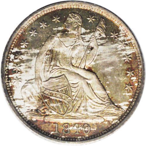 <B>1840 H10C No Drapery MS67 PCGS.</B></I> This example displays a phenomenal strike. Liberty's foot is fully defined, as are her facial features and the star centers; excellent delineation is also noted on the reverse leaves. A medley of low intensity sea-green, orange-gold, crimson, and gray-blue graces lustrous surfaces that are immaculately preserved. A simply spectacular presentation of this beautiful and popular type. Population: 5 in 67, 1 finer (10/06).<BR><BR><b>Shipping:</b> Coin/Currency (<a target="_blank" href="http://www.heritageauctions.com/common/shipping.php">view shipping information</a>)