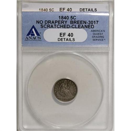 <B>1840 H10C No Drapery--Cleaned, Scratched--ANACS XF40 Details.</B></I> Breen-3017. NGC Census: (1/210). PCGS Population (3/197). Mintage: 1,000,000. Numismedia Wsl. Price for NGC/PCGS coin in XF40: $61. (#4321)<BR><I>From The Al Blythe Collection of Half Dimes.</B></I><BR><BR><B>Coin Engraver:</B> Christian Gobrecht<BR><BR><b>Shipping:</b> Coins & Currency (<a target="_blank" href="http://www.heritageauctions.com/common/shipping.php">view shipping information</a>)